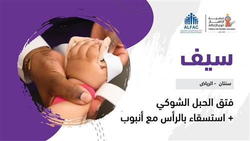 سيف يبلغ من العمر (سنتين) ويعاني من فتق الحبل الشوكي واستسقاء بالرأس مع أنبوب +تشوه ، ويحتاج إلى 50 جلسة تأهيلية تشمل:جلسات علاج طبيعي وجلسات علاج وظيفي، بدعمكم نستطيع تحقيق حلم سيف.